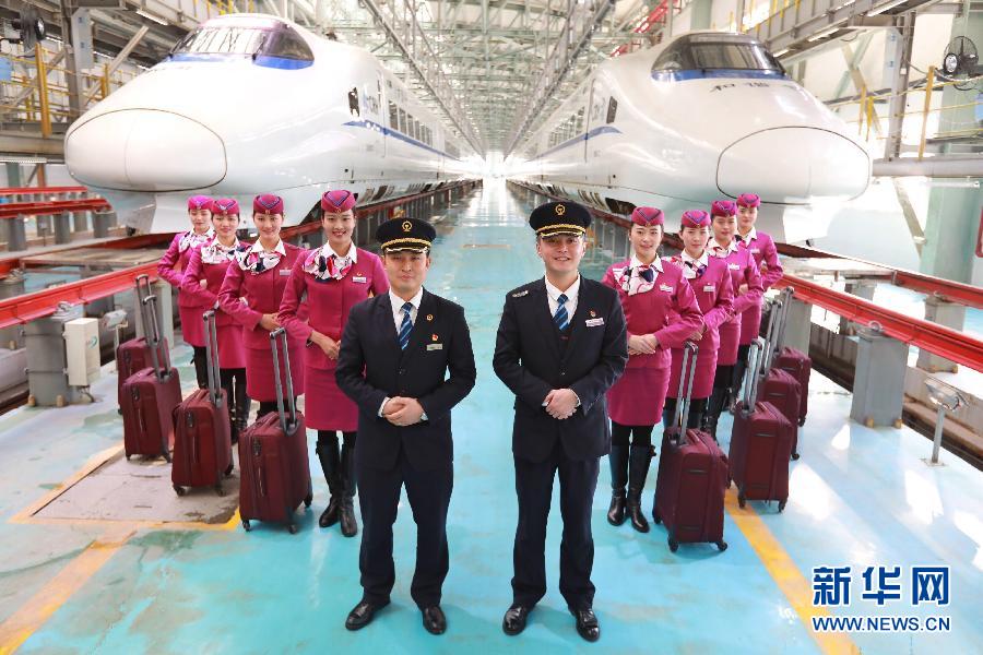 1月16日,擔任渝貴鐵路貴陽地區(qū)首發(fā)列車值乘工作的司機、乘務員、乘警等在貴陽亮相。新華社記者劉續(xù)攝