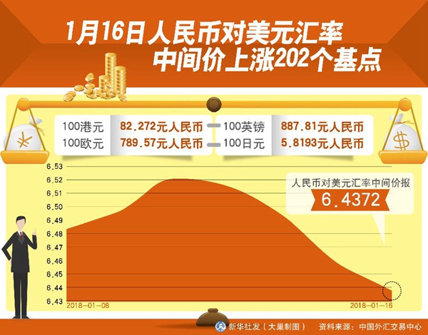 ??? 17日,人民幣對美元中間價報6.4335,創(chuàng)2015年12月10日以來新高。對越來越多走出國門的中國人來說,人民幣值不值錢很重要。記者算了一筆賬,以17日當(dāng)天的人民幣對美元中間價計算,與去年同期比,1萬元人民幣能多換近105美元。一些計劃春節(jié)出游或有留學(xué)需求的人們甚至加快了換匯步伐。>>
