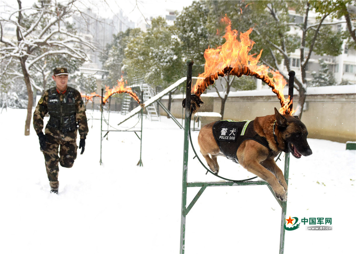 1月27日,武警安徽總隊(duì)機(jī)動支隊(duì)警犬班班長王營廣帶領(lǐng)警犬“魯克”進(jìn)行穿越火圈訓(xùn)練。