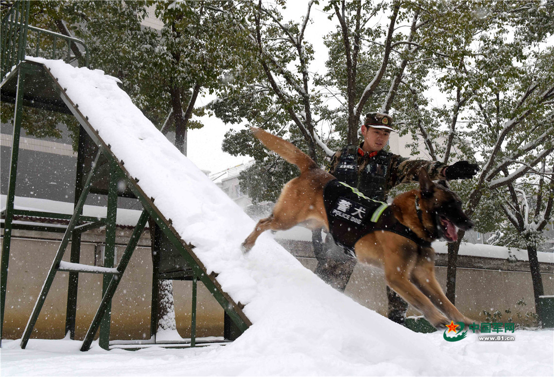 1月27日,武警安徽總隊機動支隊警犬班班長王營廣帶領(lǐng)警犬“魯克”通過障礙。