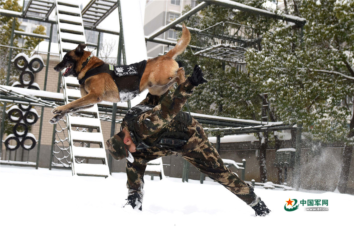 1月27日,武警安徽總隊機(jī)動支隊警犬班班長王營廣與警犬“魯克”進(jìn)行人犬結(jié)合訓(xùn)練。