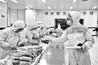 昨天,北京青年報記者走進北京京鐵列車服務(wù)有限公司餐食生產(chǎn)基地探訪。從早上8點開始,各種種類的盒飯就開始進行生產(chǎn)制作了。進貨檢驗、毛菜處理、精加工、炒制、快速降溫、稱重包裝、金屬異物檢測、抽檢留樣……一盒高鐵盒飯的生產(chǎn)出爐要經(jīng)過大大小小十幾道工序,食品安全總被放在第一位。
