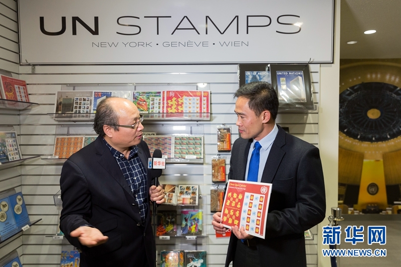 2月7日,在位于紐約的聯(lián)合國總部,聯(lián)合國郵政管理局局長謝德勝(右)接受記者采訪。新華網(wǎng)記者李木子 攝