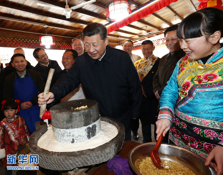 這是2月12日上午,習(xí)近平在阿壩藏族羌族自治州汶川縣映秀鎮(zhèn)考察時(shí)同居民群眾一起磨豆花。 新華社記者 鞠鵬 攝