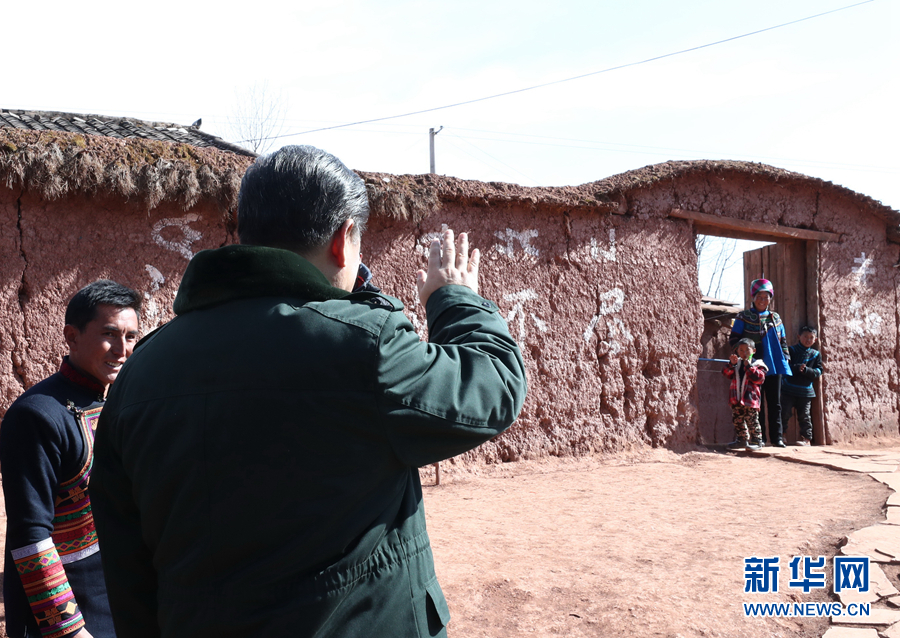 這是2月11日上午,習(xí)近平在涼山彝族自治州昭覺縣三岔河鄉(xiāng)三河村考察時同村民打招呼。 新華社記者 鞠鵬 攝