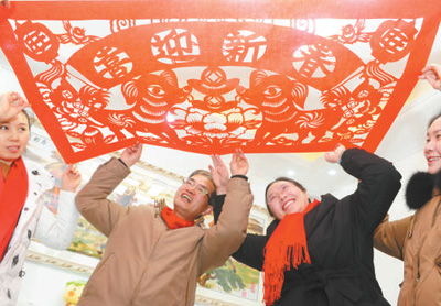 圖二 2月15日,在安徽省阜陽市臨泉路白衣橋安置區(qū)內(nèi),安置戶董杰珍(前一)和當(dāng)?shù)丶艏埶囆g(shù)家一起將喜慶窗花張貼到窗戶上。王彪 攝(人民視覺)