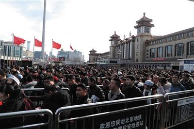 昨天上午10點半,地鐵北京站D口外立起了多條鐵柵欄,將長達百米的等待隊伍分成了四列。記者從中國鐵路總公司獲悉,2月20日,鐵路春運迎來返程客流高峰,全國鐵路預計發(fā)送旅客1060萬人次,同比增長8.3%。
