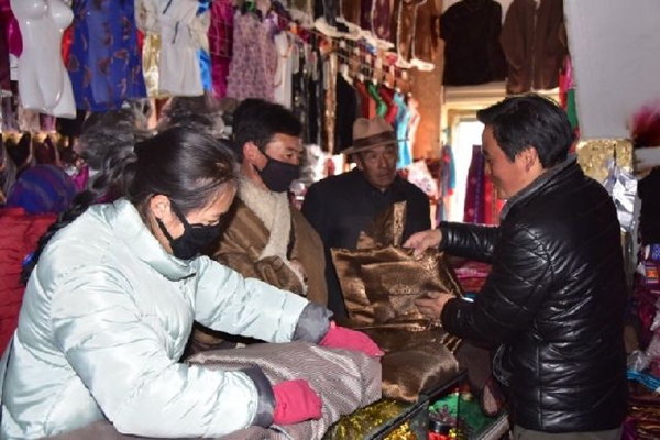 今年的藏歷新年和春節(jié)“喜相逢”。月初,同德縣城老城區(qū)車水馬龍,處處洋溢著過年的喜慶氣氛,擁擠的街道兩旁擺滿了各式各樣的商品,各族群眾忙著購置年貨。老旦正忙著打理自己的藏服店,十幾種藏服款式,吸引著一撥撥的客人惠顧,讓他幾乎沒有空閑和記者聊天。他說,這段時間每天的毛收入都在萬八千的?!翱腿硕嗟臅r候連午飯都顧不上吃!”