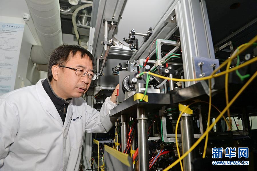 中國(guó)“墨子號(hào)”量子科學(xué)實(shí)驗(yàn)衛(wèi)星首席科學(xué)家潘建偉院士在中國(guó)科大量子存儲(chǔ)實(shí)驗(yàn)室內(nèi)了解科研情況(2017年4月20日攝)。新華社發(fā)(張大崗 攝)