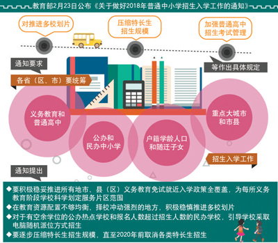 為進(jìn)一步治理義務(wù)教育階段“擇校熱”,解決中小學(xué)招生入學(xué)工作中的熱點(diǎn)難點(diǎn)問題,教育部23日公布《關(guān)于做好2018年普通中小學(xué)招生入學(xué)工作的通知》,對(duì)推進(jìn)多校劃片、壓縮特長生招生規(guī)模、加強(qiáng)普通高中招生考試管理等作出具體規(guī)定。>>