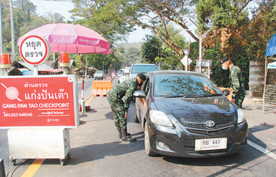 在距離泰緬邊境約40公里的格班丹檢查站,幾名警察在細致地檢查一輛越野車,緝毒犬也跳上車子,把車輛內(nèi)外嗅了個遍。檢查站旁沙袋堆壘的掩體內(nèi),全副武裝的士兵警惕地注視著周邊茂密的叢林。