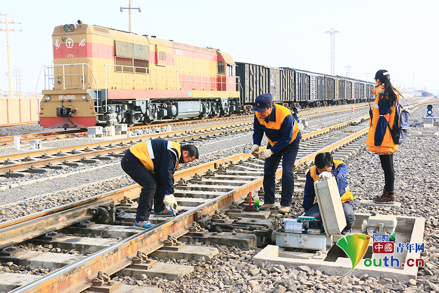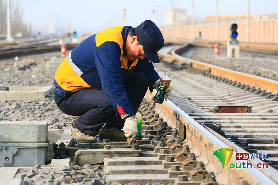 農(nóng)歷正月初八這天,邰芳鵬和工區(qū)3名年輕職工一同到現(xiàn)場(chǎng),對(duì)阿克蘇站信號(hào)機(jī)和道岔進(jìn)行巡視檢查。中國青年網(wǎng)通訊員 姚旭東 攝