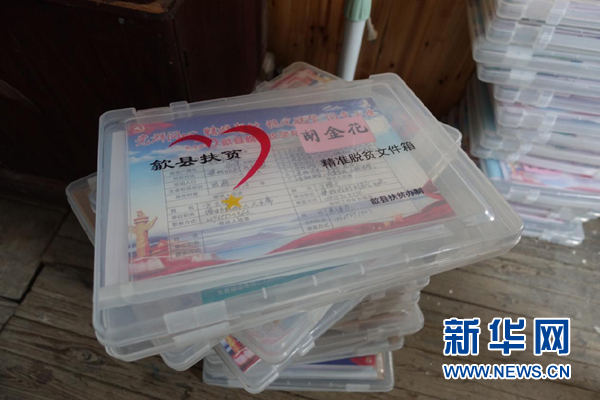 村委辦公室中的“精準(zhǔn)脫貧文件箱”,扶貧干部每月走訪時需攜帶并記錄。新華網(wǎng) 卓越 攝