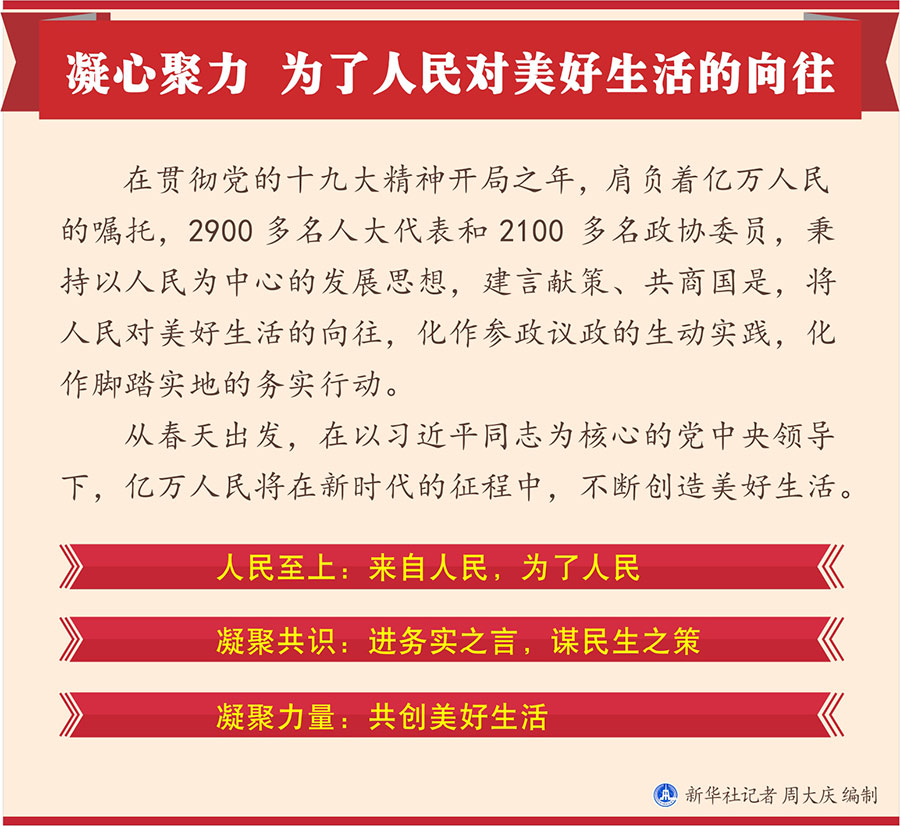 在貫徹黨的十九大精神開局之年,肩負(fù)著億萬人民的囑托,2900多名人大代表和2100多名政協(xié)委員,秉持以人民為中心的發(fā)展思想,建言獻(xiàn)策、共商國是,將人民對美好生活的向往,化作參政議政的生動實(shí)踐,化作腳踏實(shí)地的務(wù)實(shí)行動。