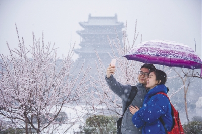 陰晴雨雪關(guān)系百姓生活,因此廣受關(guān)注。圖為日前山西省晉中市平遙縣迎來降雪天氣,游客在古城門外合影留念。梁生仁攝(新華社發(fā))