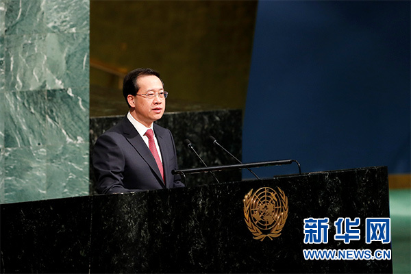 3月23日,在位于紐約的聯(lián)合國(guó)總部,中國(guó)常駐聯(lián)合國(guó)代表馬朝旭在聯(lián)合國(guó)大會(huì)“國(guó)際水行動(dòng)十年”計(jì)劃高級(jí)別活動(dòng)上發(fā)言,闡述中國(guó)水策略。新華社記者 李木子 攝