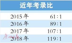 記者查詢近年廣州市公務(wù)員考試的數(shù)據(jù)發(fā)現(xiàn),近幾年競爭越發(fā)激烈,2015年計劃招錄738人,44825人成功通過審核并繳費,61∶1的平均考錄競爭比已經(jīng)高出歷史平均水平。2016年,廣州市公務(wù)員考試計劃招錄1090人,成功報名人數(shù)為97182人,平均考錄競爭比約為89∶1。到了2017年,廣州市公務(wù)員考試分為廣州和北京“雙考區(qū)”進行,計劃招錄924人,成功報名人數(shù)為99038人,平均考錄競爭比約為107∶1,競爭激烈程度超越往年。2018年廣州市公務(wù)員考試恢復(fù)單考區(qū),共設(shè)592個職位,計劃招錄722人,比起去年大幅減少,但有85770人成功報名,平均考錄競爭比達到119∶1,幾乎是2015年61∶1考錄競爭比的兩倍。