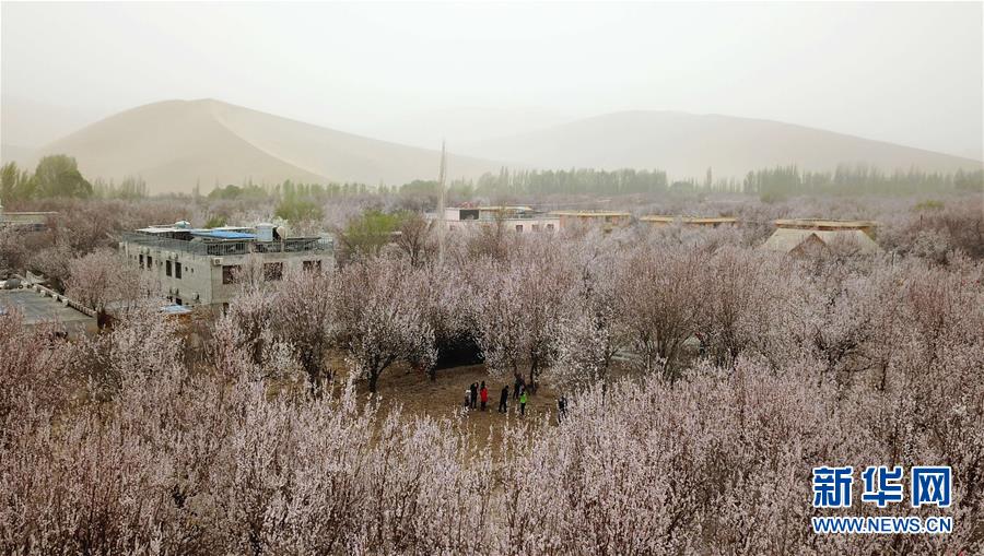 3月28日,游客在敦煌鳴沙山下的李廣杏園內(nèi)賞花。近日,甘肅省敦煌市鳴沙山下8000多畝李廣杏花競(jìng)相開放,吸引了眾多游客和市民踏青賞花。 新華社記者陳斌攝