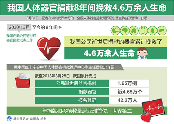 新華社武漢4月1日電(記者馮國棟)記者31日在湖北武漢舉行的“全國人體器官捐獻緬懷紀(jì)念暨宣傳普及活動”獲悉,2010年3月我國啟動公民逝世后器官捐獻試點工作至今的8年間,我國公民逝世后捐獻的器官累計挽救了4.6萬余人生命。