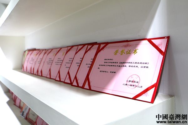 “楊尹渝班組”獲得的榮譽證書擺滿墻壁,這只是其中的一小部分。(中國臺灣網(wǎng) 盧佳靜 攝)
