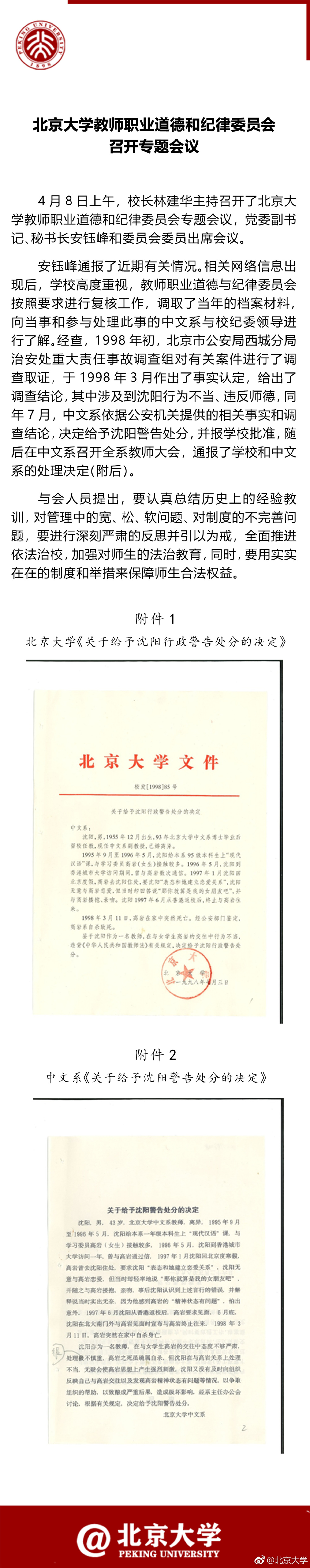 據(jù)北京大學(xué)官方微博消息,北京大學(xué)教師職業(yè)道德和紀律委員會今日召開專題會議 ,通報“沈陽事件”,并出示了當(dāng)年對其警告處分的決定。