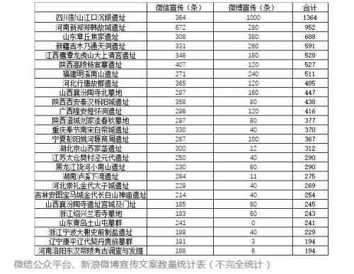 在“2017年度全國十大考古新發(fā)現(xiàn)”前一天,這篇文章對(duì)26項(xiàng)入圍“2017年度全國考古十大新發(fā)現(xiàn)”項(xiàng)目的網(wǎng)絡(luò)宣傳文案數(shù)量進(jìn)行了統(tǒng)計(jì)。胡宇煊在統(tǒng)計(jì)了微信公眾平臺(tái)、新浪微博宣傳文案數(shù)量后,對(duì)這26個(gè)項(xiàng)目進(jìn)行排序,并大膽預(yù)測了2017年度全國考古十大新發(fā)現(xiàn)的評(píng)選結(jié)果。