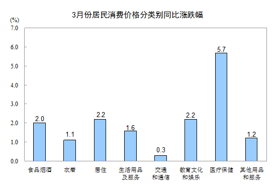 2018年3月份,全國(guó)居民消費(fèi)價(jià)格同比上漲2.1%。其中,城市上漲2.1%,農(nóng)村上漲1.9%;食品價(jià)格上漲2.1%,非食品價(jià)格上漲2.1%;消費(fèi)品價(jià)格上漲1.6%,服務(wù)價(jià)格上漲2.8%。一季度,全國(guó)居民消費(fèi)價(jià)格總水平比去年同期上漲2.1%。