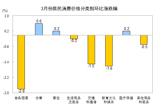 3月份,全國(guó)居民消費(fèi)價(jià)格環(huán)比下降1.1%。其中,城市下降1.1%,農(nóng)村下降1.2%;食品價(jià)格下降4.2%,非食品價(jià)格下降0.4%;消費(fèi)品價(jià)格下降1.4%,服務(wù)價(jià)格下降0.7%。