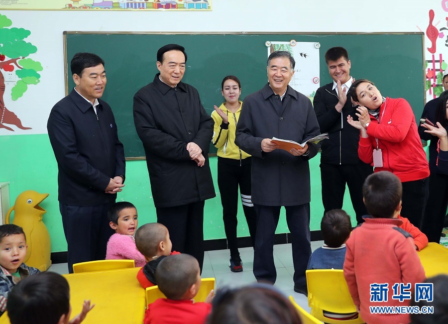 4月10日至14日,中共中央政治局常委、全國(guó)政協(xié)主席汪洋在新疆調(diào)研。這是4月11日,汪洋來(lái)到和田縣村里的幼兒園看望孩子?!⌒氯A社記者劉衛(wèi)兵 攝
