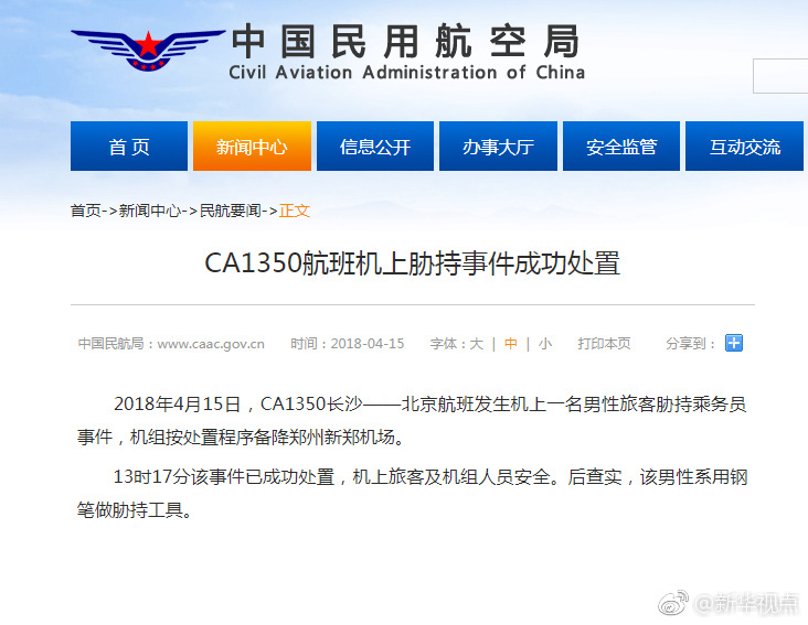 新華網(wǎng)北京4月15日電 民航局官網(wǎng)消息:2018年4月15日,CA1350長沙——北京航班發(fā)生機上一名男性旅客脅持乘務員事件,機組按處置程序備降鄭州新鄭機場。13時17分該事件已成功處置,機上旅客及機組人員安全。后查實,該男性系用鋼筆做脅持工具。(據(jù)新華社“新華視點”微博報道) ?????