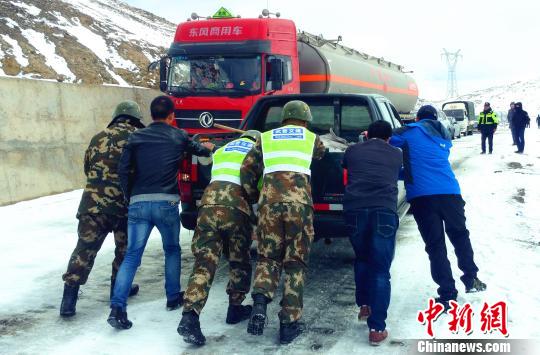 武警某部交通三支隊(duì)駐左貢縣中隊(duì)官兵與現(xiàn)場人員一起疏通車輛 路凱 攝