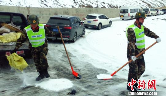 武警某部交通三支隊(duì)駐左貢縣中隊(duì)官兵向結(jié)冰路面拋撒工業(yè)鹽 路凱 攝
