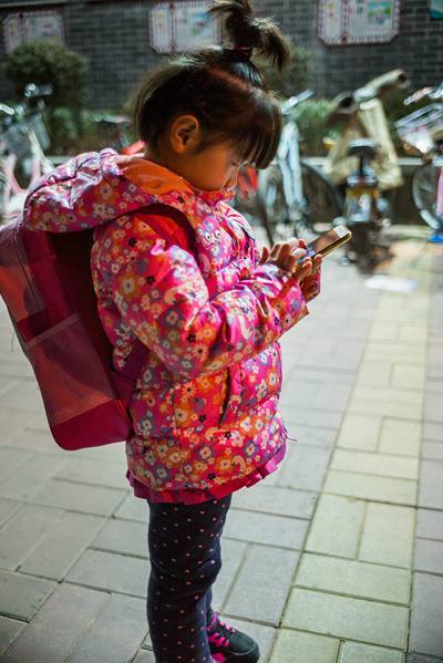 1月19日,在濟(jì)南實(shí)驗(yàn)初中校門外,一位和姑姑來等表姐放學(xué)的小女孩,背著幼兒園的小書包,站在那里低頭聚精會神地玩著姑姑的手機(jī)。