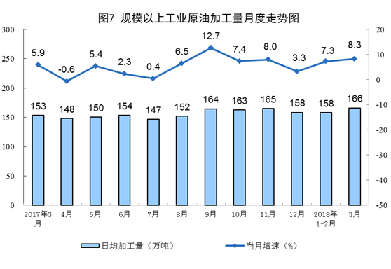 受去年下半年國(guó)內(nèi)新增煉化產(chǎn)能陸續(xù)投產(chǎn)和2018年首批原油進(jìn)口配額大幅增加影響,一季度原油加工量明顯增長(zhǎng),同比增長(zhǎng)7.5%,增速比去年同期加快3.0個(gè)百分點(diǎn)。3月份,原油加工量同比增長(zhǎng)8.3%,日均加工166.2萬噸,為歷史最高水平。其中,汽油、煤油和柴油產(chǎn)量分別增長(zhǎng)5.7%、14.6%和1.3%。