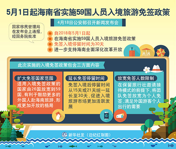 新華社北京4月18日電(記者 劉奕湛、丁小溪)公安部18日召開(kāi)新聞發(fā)布會(huì),國(guó)家移民管理局在發(fā)布會(huì)上通報(bào),經(jīng)國(guó)務(wù)院批準(zhǔn),自2018年5月1日起,在海南省實(shí)施59國(guó)人員入境旅游免簽政策,免簽入境停留時(shí)間為30天,進(jìn)一步支持海南全面深化改革開(kāi)放。