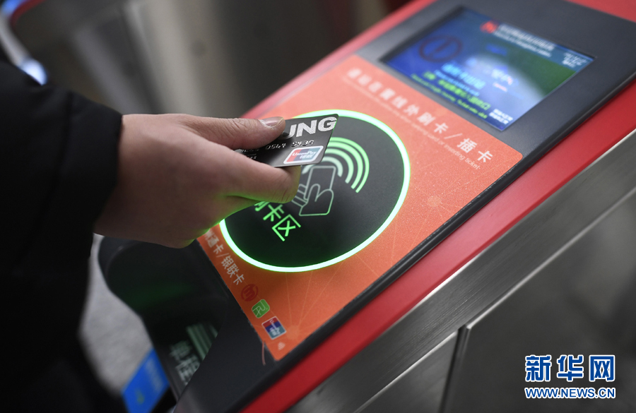 乘客在杭州地鐵豐潭路站體驗(yàn)使用帶有閃付功能的銀聯(lián)IC卡過閘乘車(2017年12月27日攝)。新華社記者 黃宗治 攝