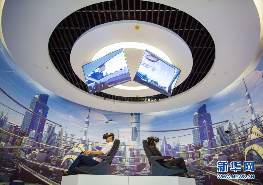 市民在內(nèi)蒙古呼和浩特玉泉區(qū)大數(shù)據(jù)應(yīng)用產(chǎn)業(yè)基地體驗(yàn)VR眼鏡(2017年8月1日攝)。新華社發(fā)(丁根厚 攝)
