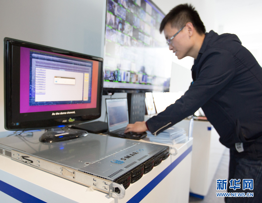 在北京智能計(jì)算產(chǎn)業(yè)研究院舉行的發(fā)布會(huì)上,工作人員在現(xiàn)場(chǎng)演示高通量人工智能一體機(jī)的實(shí)際應(yīng)用(2017年12月6日攝)。新華社記者 金立旺 攝