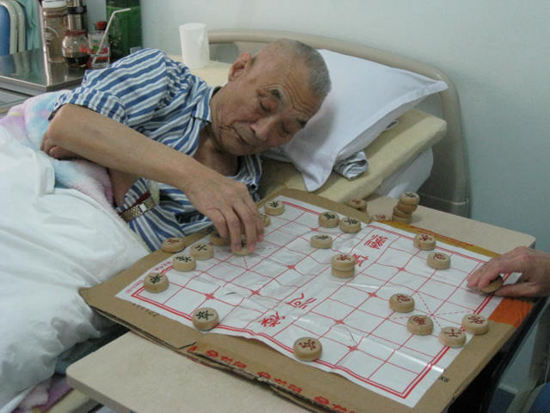 德勝社區(qū)衛(wèi)生服務(wù)中心臨終關(guān)懷科一位正在下象棋的老爺爺。該科室護士長劉曉惠說,這位老爺爺唯一的愛好就是下象棋,“要是下跳棋我們還能陪一陪,象棋都不會”。于是,醫(yī)院便找了一位會下棋的護工陪這位老爺爺下象棋。圖片中下象棋用的硬紙板也是護士們幫忙做的。德勝社區(qū)衛(wèi)生服務(wù)中心臨終關(guān)懷科供圖