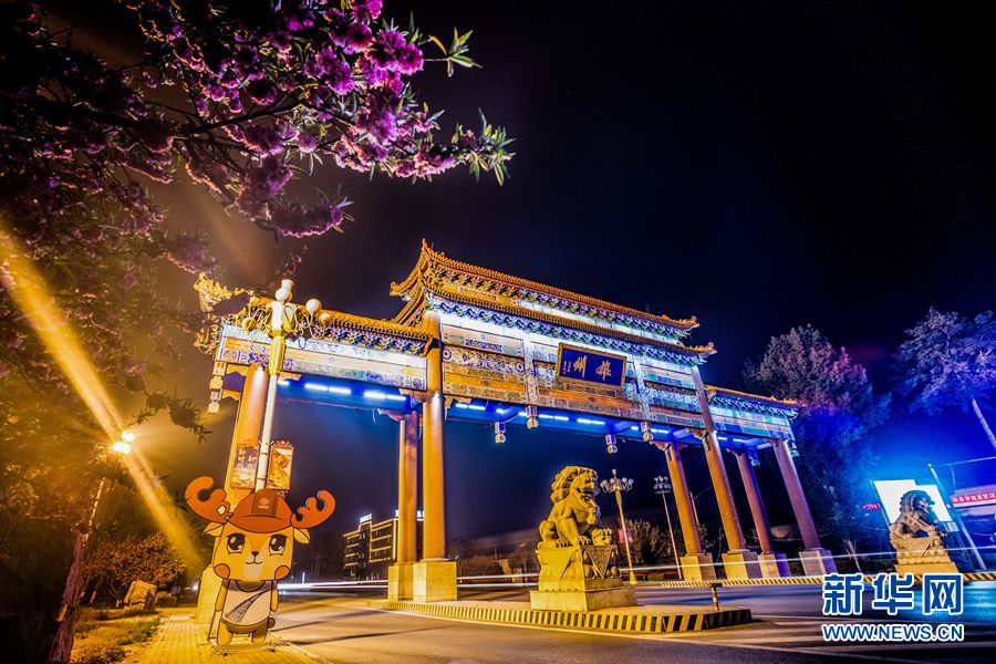 夜幕中的春花與雄縣牌樓相互印襯。中國(guó)雄安官網(wǎng)記者 王永康 攝