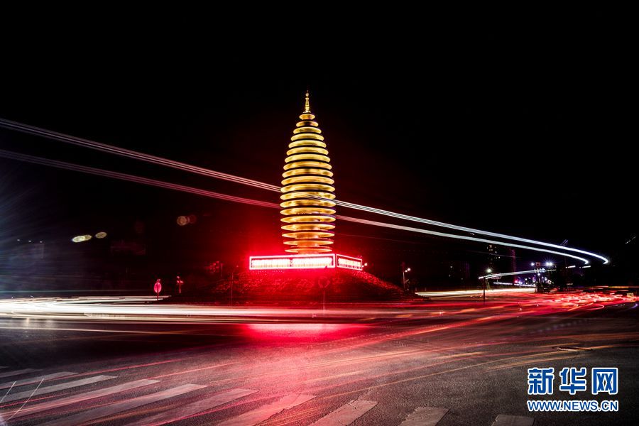 夜幕中容城縣地標(biāo)建筑容和塔,大車車頂燈駛向奧威路后,在夜空留下一道絢麗的光。中國(guó)雄安官網(wǎng)記者 王永康 攝