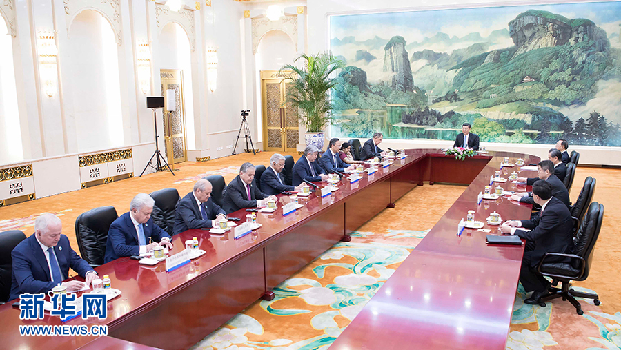 4月23日,國家主席習(xí)近平在北京人民大會(huì)堂集體會(huì)見來華出席上海合作組織成員國外長理事會(huì)會(huì)議的俄羅斯外長拉夫羅夫、印度外長斯瓦拉杰、哈薩克斯坦外長阿布德拉赫曼諾夫、吉爾吉斯斯坦外長阿布德爾達(dá)耶夫、巴基斯坦外長阿西夫、塔吉克斯坦外長阿斯洛夫、烏茲別克斯坦外長卡米洛夫、上海合作組織秘書長阿利莫夫、上海合作組織地區(qū)反恐怖機(jī)構(gòu)執(zhí)委會(huì)主任瑟索耶夫。新華社記者 李濤 攝
