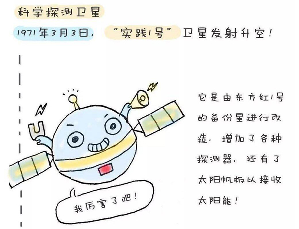 實踐一號衛(wèi)星是中國第一顆科學(xué)探測和技術(shù)實驗衛(wèi)星,于1971年3月3日發(fā)射,重221公斤,外形為近似球體的多面體,直徑1米。它的主要任務(wù)是試驗星上太陽能電池供電系統(tǒng),主動無源溫度控制系統(tǒng),長壽命遙測設(shè)備及無線電線路性能及其他太空環(huán)境探測。實踐一號的設(shè)計壽命為一年,實際在太空中工作了8年之久,直到1979年6月17日才返回大氣層燒毀。
