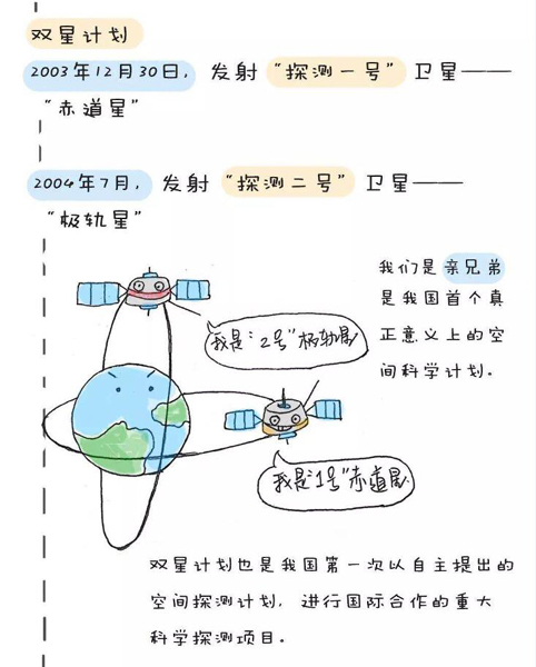 2003年12月30日,中國與歐洲空間局的合作項目“地球空間雙星探測計劃”中的第一顆衛(wèi)星“探測一號”成功發(fā)射。這是中國第一次發(fā)射高軌道衛(wèi)星,標志著中國高水平的空間物理與環(huán)境探測進入實質(zhì)性發(fā)展階段。2004年7月,“探測二號”衛(wèi)星升空,與已在軌運行的“探測一號”衛(wèi)星構(gòu)成了具有創(chuàng)新特色的星座式獨立探測體系。兩顆衛(wèi)星互相配合,分別運行于目前國際上地球空間探測衛(wèi)星尚未覆蓋的重要空間活動區(qū)域,主要進行太陽活動、行星際擾動觸發(fā)磁層空間暴和災(zāi)害性地球空間天氣的物理過程等科學(xué)研究。