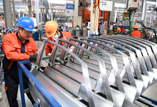 2018年3月27日,工人們在浙江臨海的吉利汽車生產(chǎn)車間工作 殷博古 攝