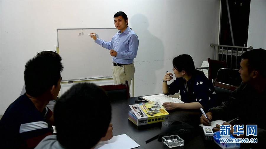 濟(jì)南翼菲自動化科技有限公司創(chuàng)始人張賽與同事們開會(2017年9月25日攝)。新華社發(fā)