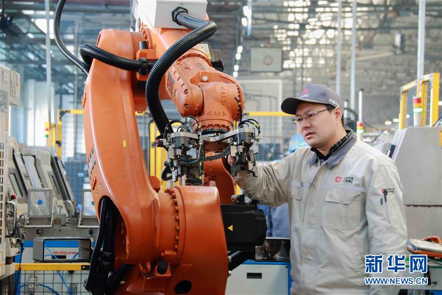 中國中車戚墅堰機(jī)車車輛工藝研究所有限公司首席技師劉云清在改進(jìn)中車戚墅堰所首條機(jī)器人渦輪殼生產(chǎn)線的機(jī)器人夾具(資料照片)。新華社發(fā)