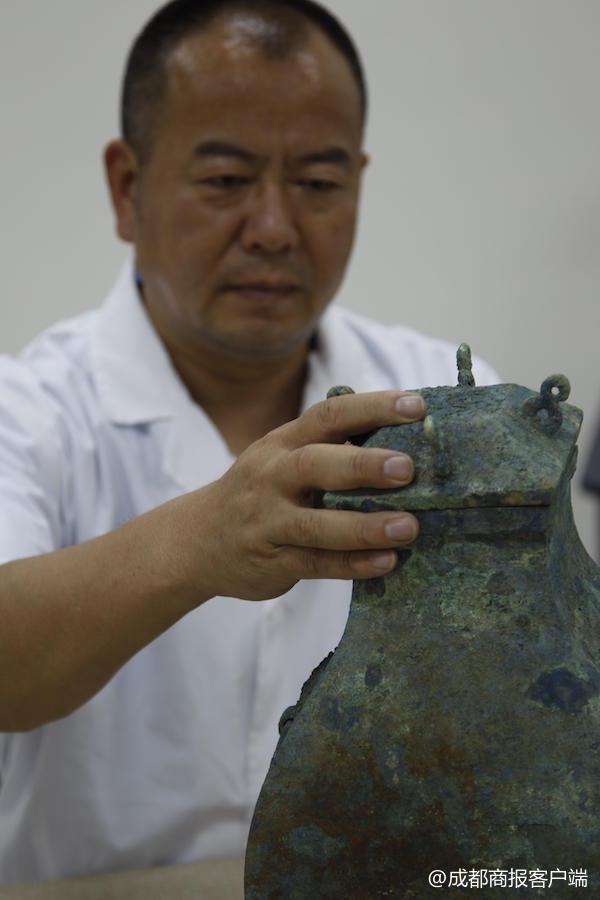 成都商報客戶端記者在三星堆博物館見到郭漢中時,這位被稱作“青銅師”的文物修復(fù)專家正在修復(fù)一件銅尊。這樣的工作就是郭漢中每天的工作,從早到晚和文物打交道的日子持續(xù)了30年。