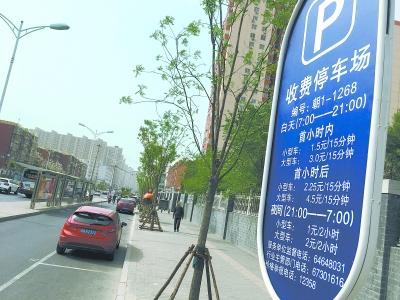 路側(cè)停車一刻鐘免費(fèi),已經(jīng)在正規(guī)管理的停車場(chǎng)實(shí)施了,但路側(cè)停車的收費(fèi)牌卻大多還未更新。 記者 甘南 攝