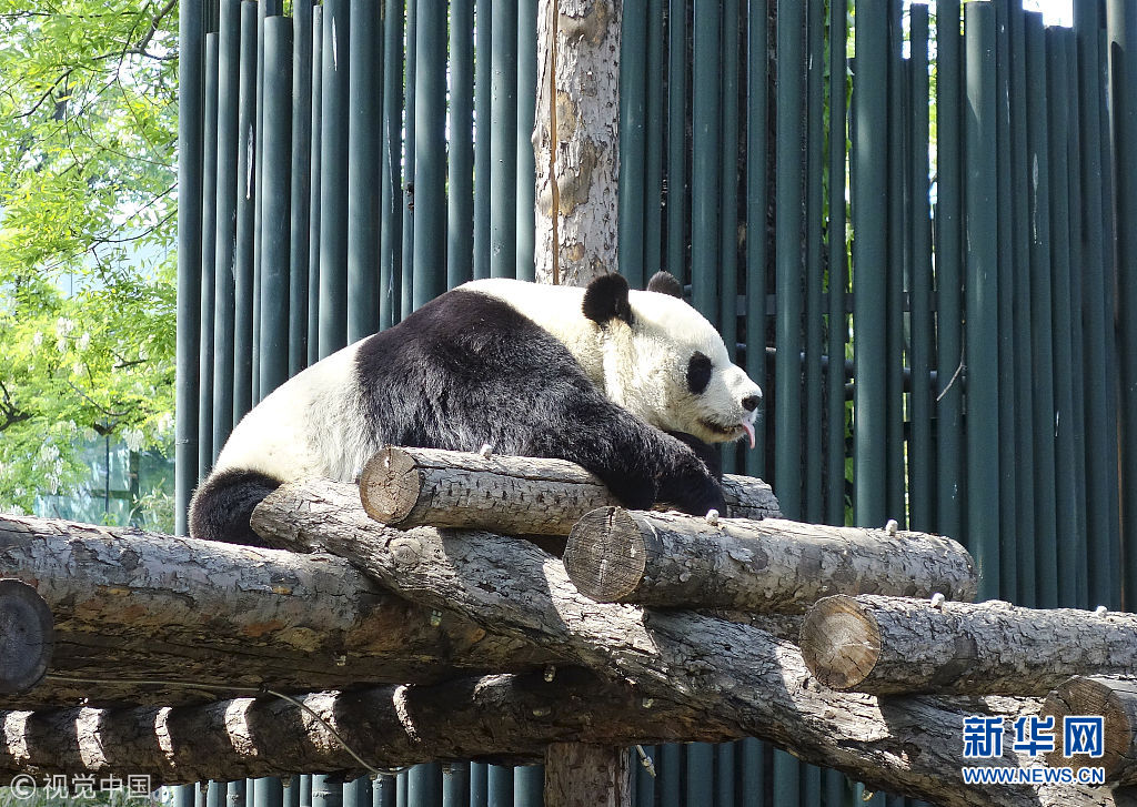 5月2日,在動(dòng)物園內(nèi),熊貓曬著太陽(yáng),時(shí)不時(shí)伸個(gè)懶腰,翻個(gè)身,笨拙的動(dòng)作盡顯萌態(tài)。(圖片來(lái)源:視覺(jué)中國(guó))